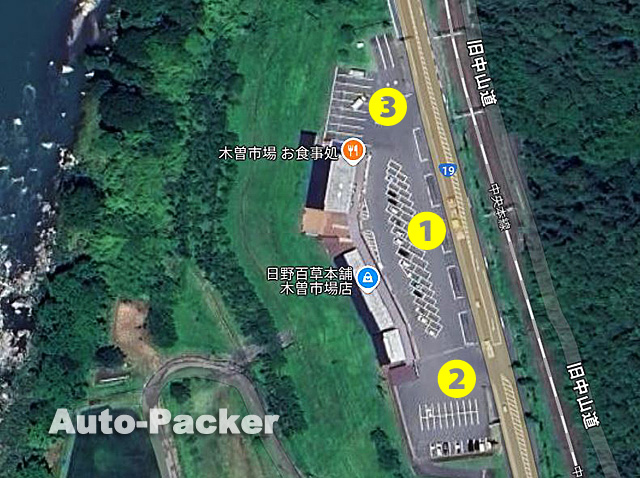 いっぽうこれから説明する「道の駅 木曽福島」は、買い物と温泉の利便性はいいが、国道JとRの線路がすぐ横を通り、駐車場には厄介な傾斜がある。