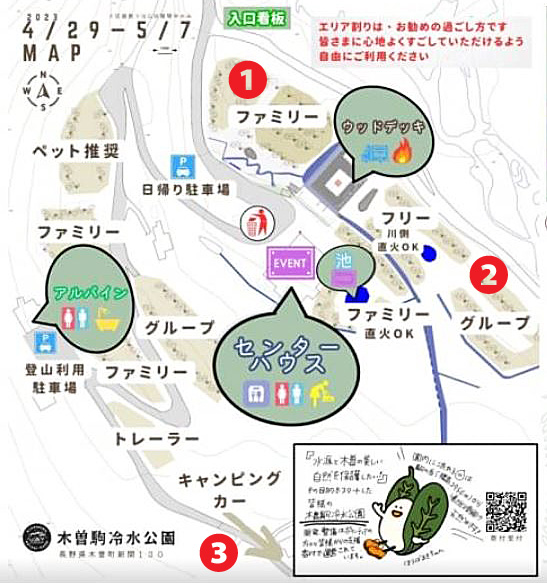 「木曽駒冷水公園」の敷地は、❶❷とセンターハウスのあるところが1段目、お風呂が使えるペンション・アルパインが2段目、そしてキャンピングカーと書かれた広い場所が3段目の、いわば「三階建て」のような構造になっており、このマップがもっともリアルに近く、それぞれを歩いて移動するのは相当に面倒だ。