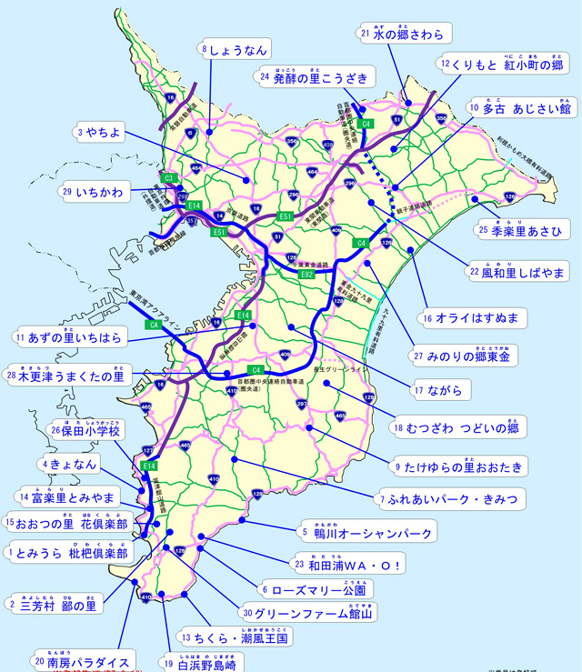 一般的に千葉県のエリア区分は、このように細かく設定されているようだが、県外から訪れる観光客にすれば、基本は『県南部の房総半島と北部地域』の2つに大別され、道の駅の分布はその9割近くが「房総半島」に集中している。