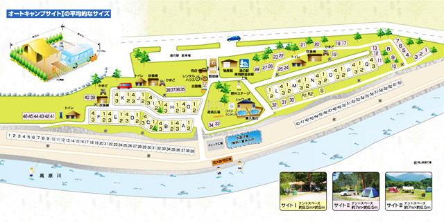 「奥飛騨温泉郷オートキャンプ場」のサイトは、電源の有無と広さ及び場所によってⅠ~Ⅲの3つのクラスに分けられている。