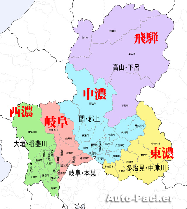 慣習的な岐阜県の地域区分は、赤で示した「西濃」「岐阜」「中濃」「東濃」「飛騨」の5つだが、これは中京圏在住者でないと、なかなかピンと来るものではないと思うので、黒の太字で書かれた、地域を代表する町名を使った区分と併用してみた。