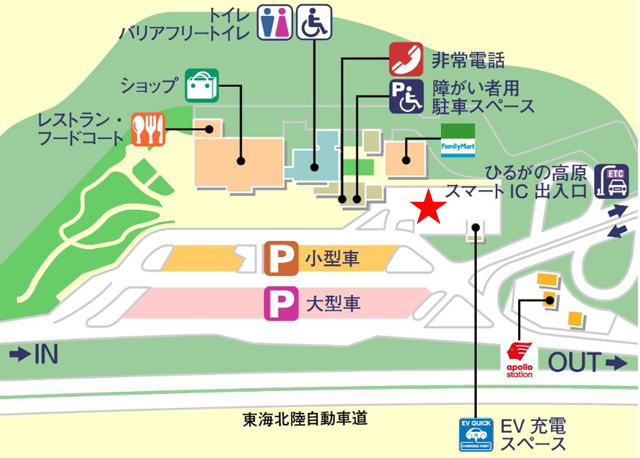 こちらが「ひるがの高原SA」の下り線、高山から白川郷、さらには金沢、富山方面行きのレイアウト図になるが、留意点はひとつだけ。
