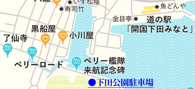 正確な駐車場の位置を示せないので、下田公園の手前100メートルほどの向かいにある、「ペリー艦隊来校記念碑」を目印として添付。