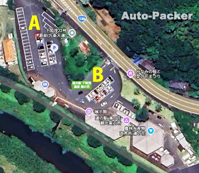 「道の駅 下賀茂温泉湯の花」の駐車場は、AとBの大きく2つのブロックに分かれているが、いずれもフラットで車中泊に支障はない。