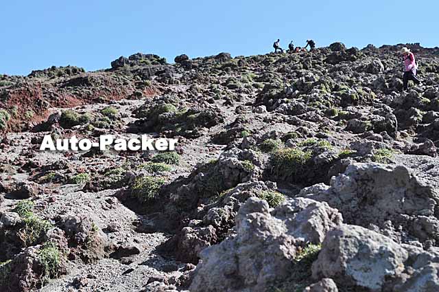 そこから頂上までは再び急斜面が続く。ここで冒頭で紹介したスパッツがあると、堆積した火山礫が靴の中に入るのを防いでくれる。