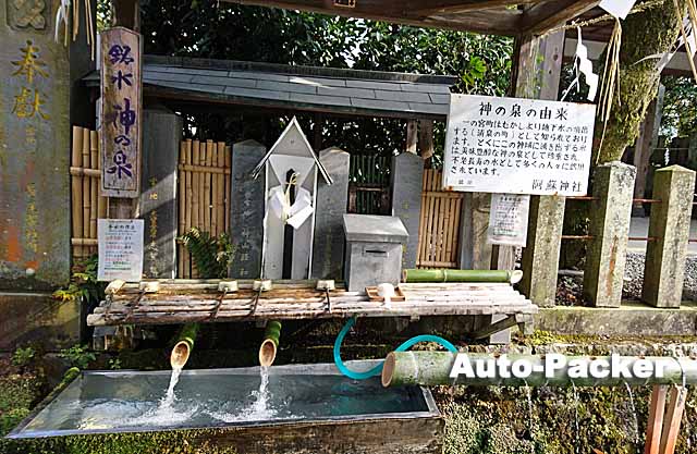 阿蘇神社の楼門前には「横参道」と呼ばれる珍しい通りがあり、その途中にある「神の泉」では、昔から変わらぬ名水を自由に汲むことができる。