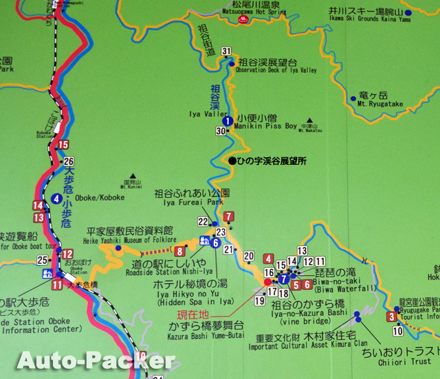 こちらがその「祖谷渓」の拡大地図で、これに沿って上(北)から下(南)へと、「祖谷渓」の見どころを紹介していくことにしよう。