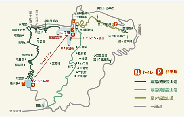 「寒霞渓」にはロープウェイを挟むように、「表12景」「裏8景」と呼ばれる2つの景観群に沿った2本の登山道があるが、利便性が高いのはマップの左側にエンジ色で示された「表登山道」で、クルマを停めた「こううん駅前」の駐車場に自然と戻って来ることができる。