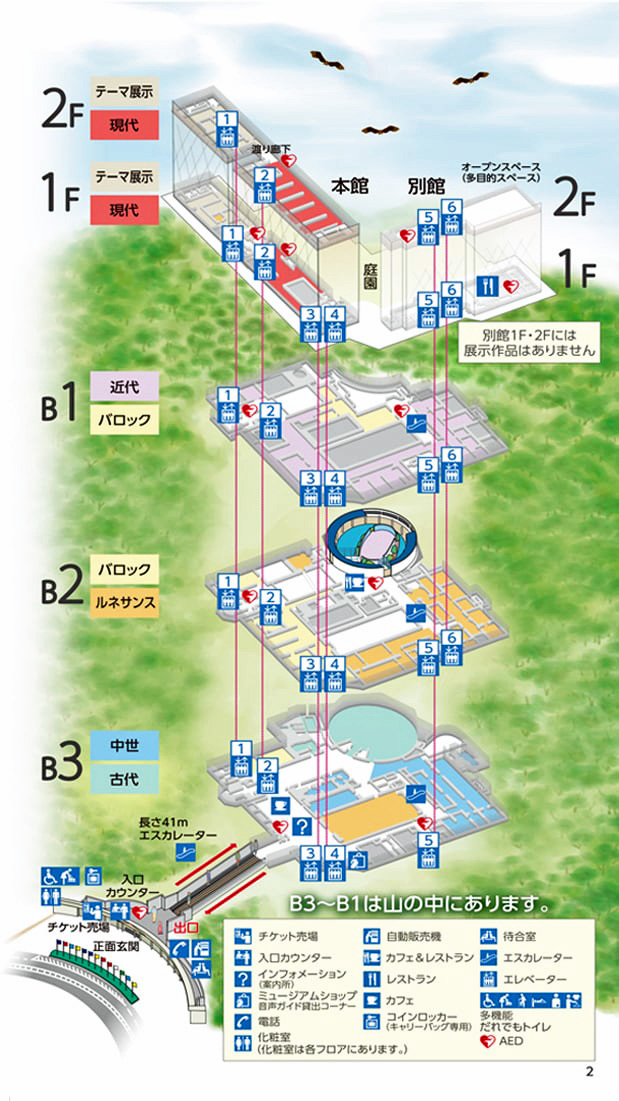 また旅行者にお勧めなのは、下記の作品をB3から上層階へと歴史順に見ながら進める「時短コース」で、館内にあるマップ&ガイドにルートが掲載されている。