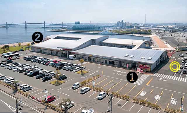 トイレがある駐車場はマップのPE6で、写真の物産館「いわき・ら・ら・ミュウ」の❶と❷の場所にある。