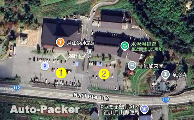 こちらが「道の駅 にしかわ」の航空写真で、駐車場は真ん中に通路を挟んで、❶の駅舎にあたる「月山名水館」前と、❷の日帰り温泉「水沢温泉館」前の2ヶ所に一応は別れている。