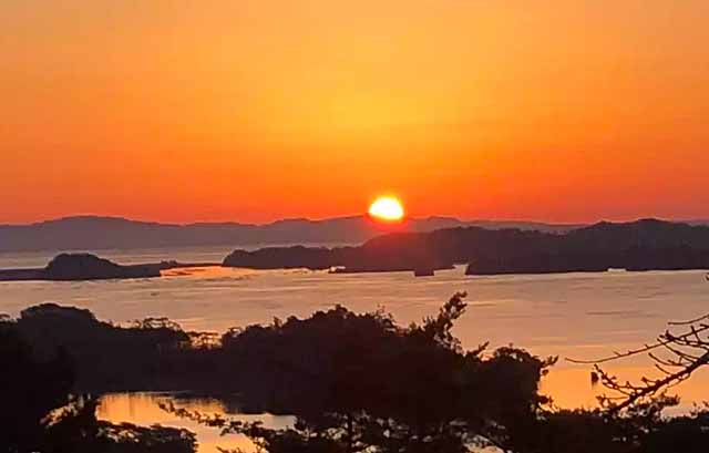 いっぽうこちらの写真は、「西行戻しの松公園」よりずっと東にある、「松島四大観」のひとつに挙がる「大高森」から撮影した夕陽。