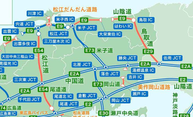 ナビゲーションに任せれば、上に書いた『中国道→米子道→松江道』を通る最短ルートが案内されると思う。