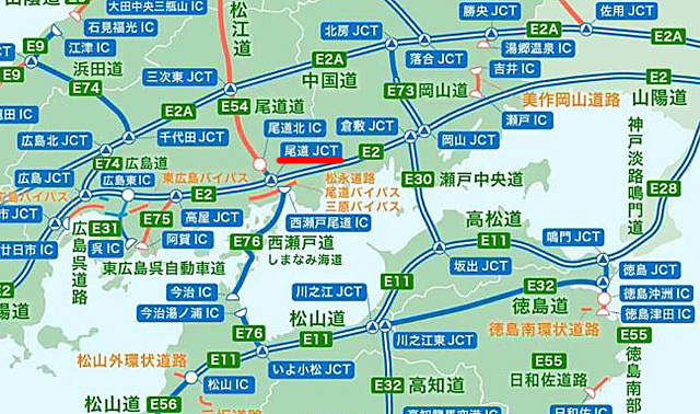 この高速道路マップで分かるように、「尾道」は近畿と九州を結ぶ「E2(山陽道)」と、四国と山陰を結ぶE76(しまなみ海道)・E54(尾道道・松江道)の交差点に位置し、陸上交通の要になっているのだが、とりわけ注目すべきは、「しまなみ海道」の存在だと思う。