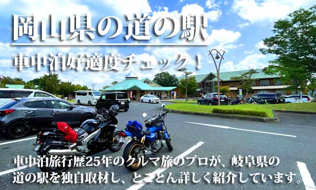 25年のキャリアを誇る車中泊旅行家が、現地取材してきた岡山県内の道の駅・SA/PA・RVパーク・オートキャンプ場・コインパーキング・無料駐車場等の車中泊スポットを個別に詳しく紹介しています。