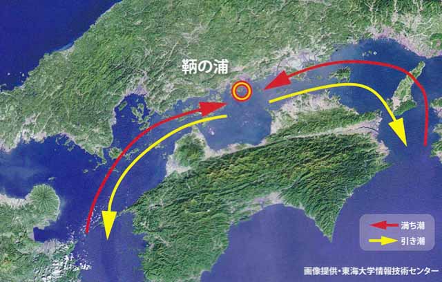 古来から瀬戸内海では、満潮時に西は「豊後水道」や「関門海峡」、東は「紀伊水道」から潮が流れ込んで「鞆の浦」沖でぶつかり、逆に干潮時には「鞆の浦」沖を境に、東西に分かれて流れ出している。