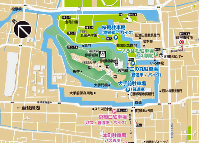 彦根城の駐車場と城下町