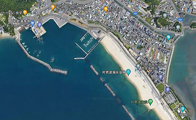 「片男波」は、阪和自動車道「和歌山インター」から約10キロ・クルマで30分ほどのところにある紀北最大のロングビーチで、海岸沿いに「新和歌浦」と通じている。