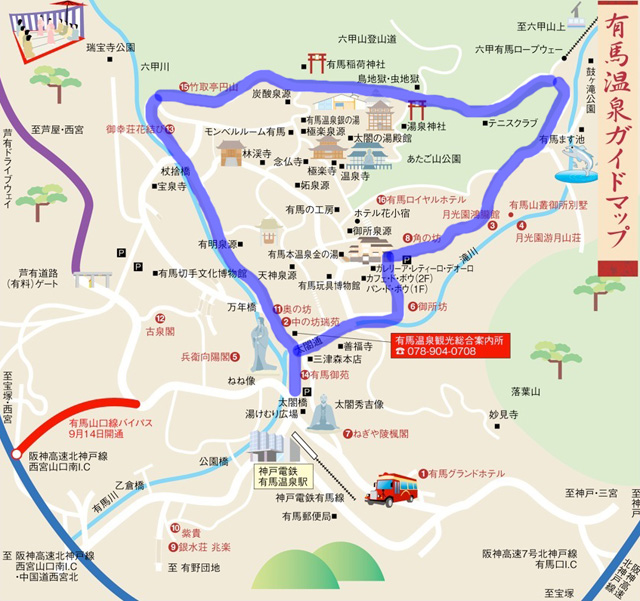 「有馬温泉」での駐車場選びのポイントは、温泉街の上に停めるか、下に停めるかにある。